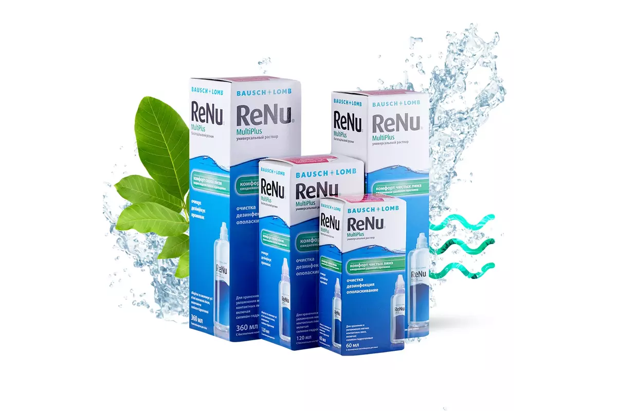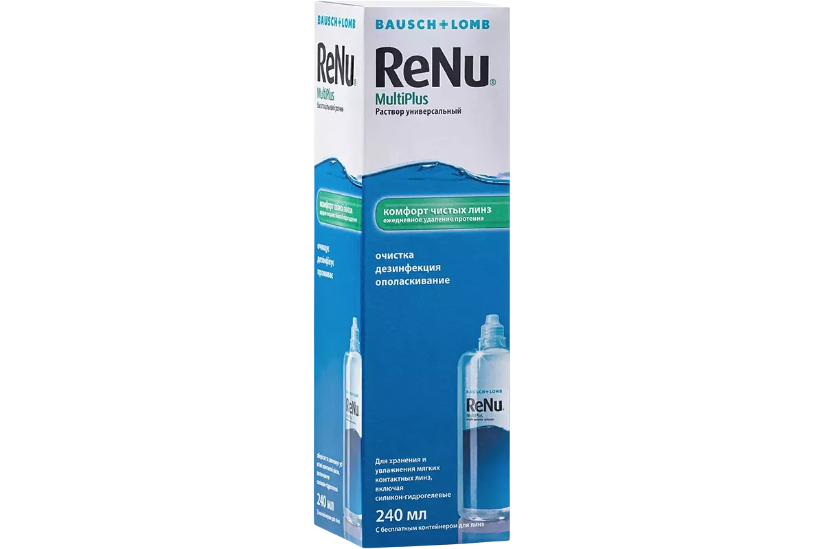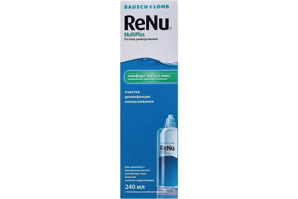 ReNu MultiPlus - универсальный раствор для хранения, очистки, дезинфекции, промывания и увлажнения всех типов мягких контактных линз. Производитель - Bausch&Lomb (США).