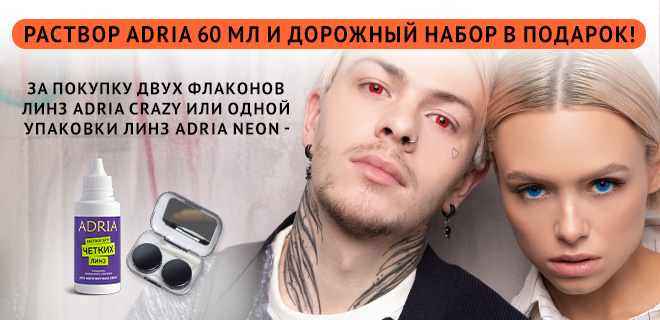 При покупке линз ADRIA Crazy (2 флакона) или линз ADRIA Neon (1 упаковка) - раствор для линз ADRIA Plus 60 мл и набор для линз ADRIA мини (прямогульный) в подарок.